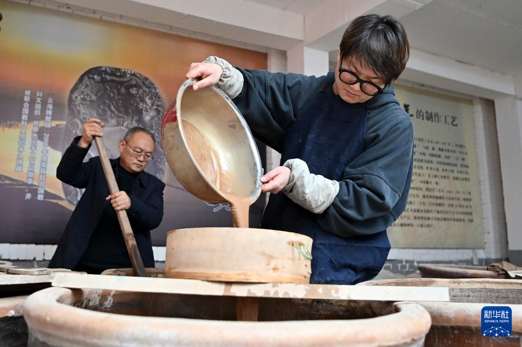 在山西省新绛县光村绛州澄泥砚生产基地,蔺霄麟(右)和父亲蔺涛在澄清过滤泥土(2023年2月14日摄)。新华社记者 杨晨光 摄