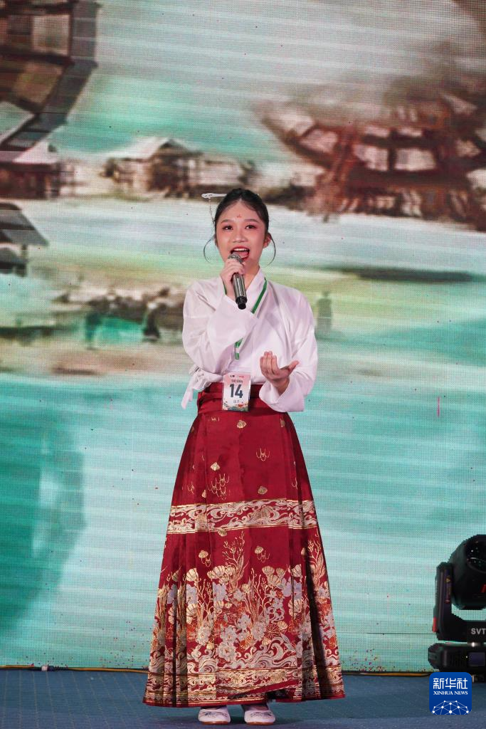 5月26日,选手在河内举行的第17届“汉语桥”世界中学生中文比赛越南北部及中部赛区决赛上展示才艺。新华社记者 胡佳丽 摄