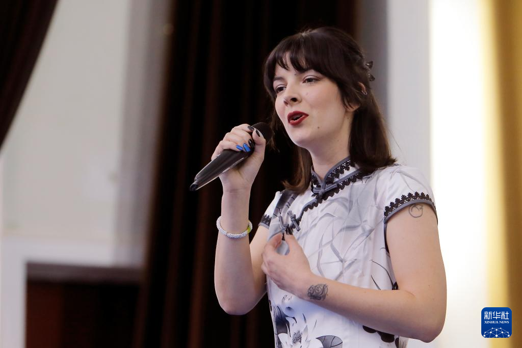 这是5月26日在布加勒斯特举行的第23届“汉语桥”世界大学生中文比赛罗马尼亚赛区决赛中拍摄的特等奖获得者伊万娜·米哈伊。新华社发(克里斯蒂安·克丽丝特尔摄)