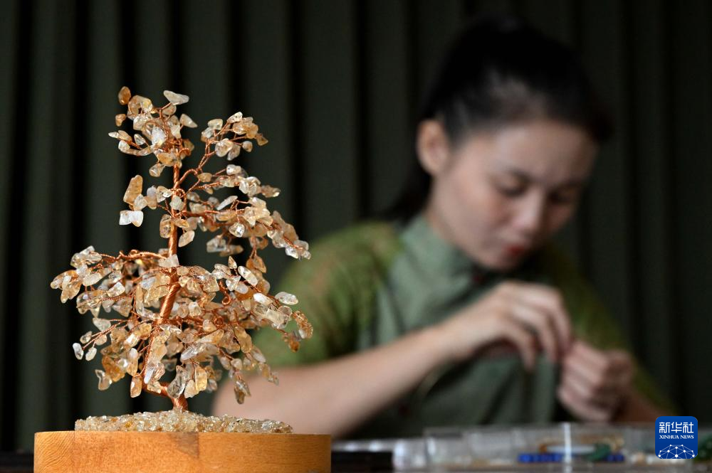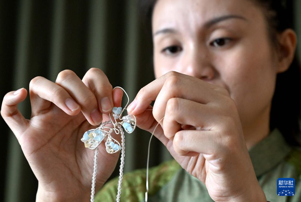 楚蒙丹在位于洛阳市的非遗体验馆里制作辑珠饰品(9月12日摄)。新华社记者 李安 摄