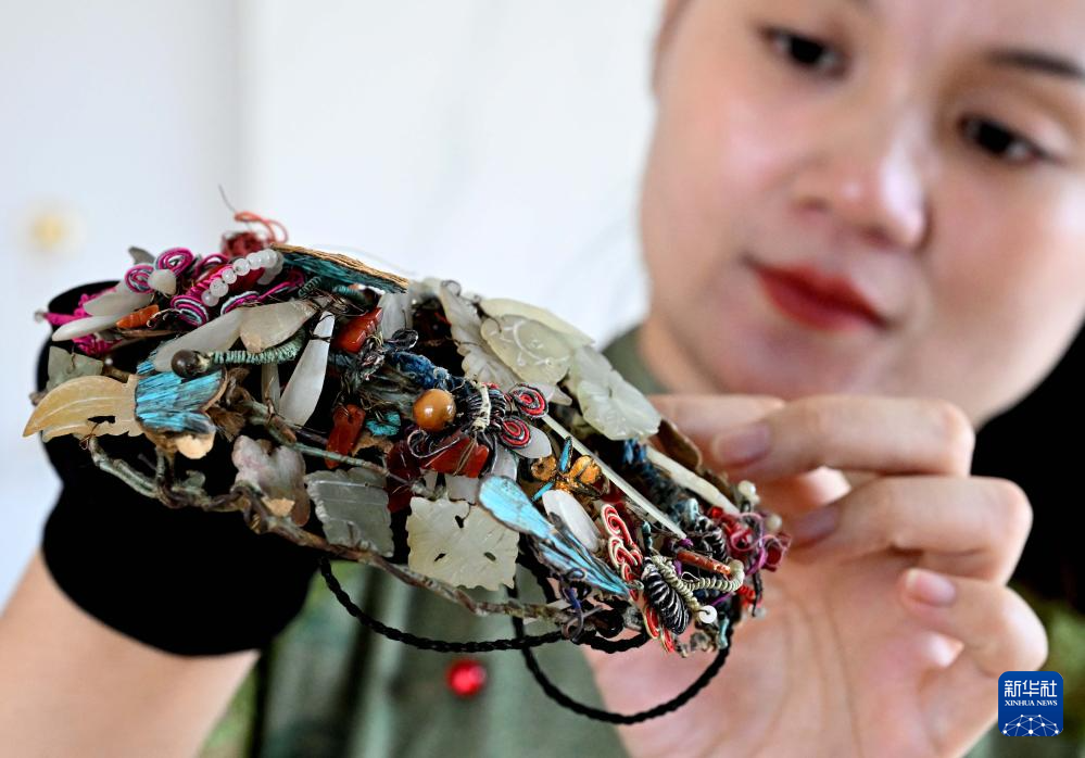 楚蒙丹在位于洛阳市的非遗体验馆里查看一件传统饰品,学习辑珠技艺的手法和配色(9月12日摄)。新华社记者 李安 摄