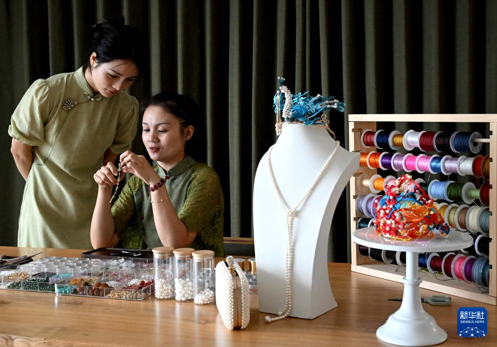 楚蒙丹(右)在位于洛阳市的非遗体验馆里向徒弟讲授辑珠技法(9月12日摄)。新华社记者 李安 摄