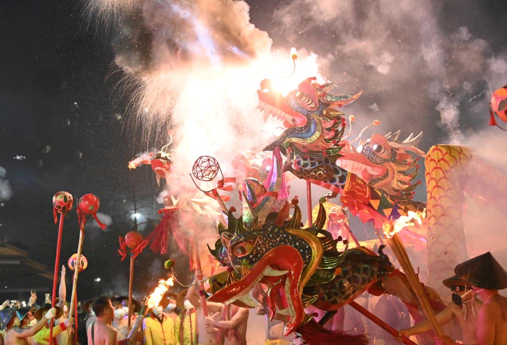 爆竹声声,火光闪烁,百余条彩龙穿梭在广西宾阳县的大街小巷,伴着鞭炮火光,龙舞不止,一派热闹景象。