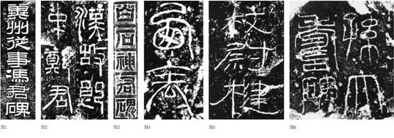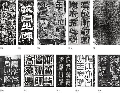 以上1、2两点,在汉以后的碑额中均可以得到体现。汉碑额的镌刻工艺,其最大的特色,在于书写的变化丰富,配以阴刻、阳刻、单刀、双刀的交互并用,因此产生了丰富的视觉效果—点画线条变化多端。根据其形迹特征,大致可以概括为如下几类: