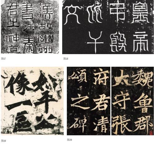 这种对刀感的凸显,在东汉以后也不乏继承者,尤其是在北魏的一些碑额书法中。如北魏太和十八年(494)立的《皇帝吊殷比干文》(图18)、北魏太和二十二年(498)刻的《始平公造像》(图19)、魏碑正光三年(522)立的《张猛龙碑》(图20)。这些碑额书法所体现出来的刀感,光洁爽劲,与东汉相比,真是有过之而无不及。而东汉碑额书法的特点也在与它们的比较中见出:即便是突出刀感,仍然蕴含了较多笔意。