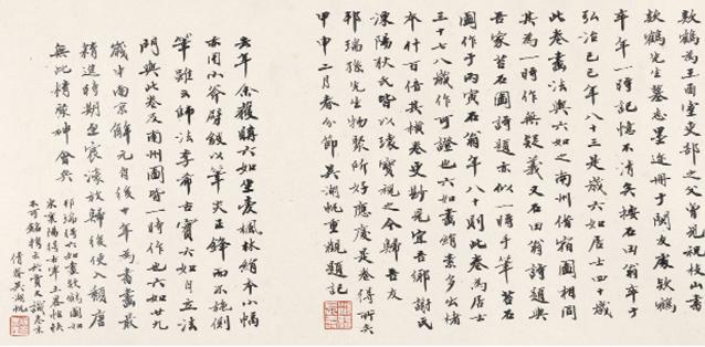 释文:款鹤为王酉室吏部之父,曾见祝枝山书《款鹤先生墓志墨迹》册于闽友处,款鹤卒年一时记忆不清矣。按,石田翁卒于弘治己巳年八十三岁,是岁六如居士四十岁。此卷画法与六如之《南州借宿图》相同,其为一时作无疑义。又石田翁诗题与吾家《苔石图》诗题亦似一时手笔,《苔石图》作于丙寅,石翁年八十,则此卷为居士三十七八岁作可证也。六如画绢素多出楮本什百倍,其横卷更鲜见宜,吾乡谢氏、溧阳狄氏皆以环宝视之,今归吾友邦瑞孙先生。物聚所好,应庆是卷得所矣。甲申二月春分节,吴湖帆重观题记。去年余获购六如《坐爱枫林》绢本小幅,亦用小斧劈皴以笔尖正锋而不施侧笔,虽云师法李希古,实六如自立法门,与此卷及《南州图》皆一时作也。六如廿九岁中南京解元,自后十年为书画最精进时期,至宸濠放归后,便入颓唐,无此精聚神会矣。邦瑞得六如画《款鹤图》,如米襄阳得右军《王略帖》,快不可铭,携示共赏又识卷末。倩菴吴湖帆。