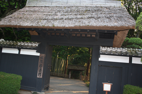 笔者在考察偕乐园时注意到东门附近由南到北依次有“御成门”与“好文亭表门”(正门,参见图片11),故依次从御成门与好文亭表门进入偕乐园,竟发现每道门附近的设计都不一样。其中好文亭表门令人印象深刻,位于园内西北面,被涂上黑漆,所以通常被称为“黑门”。从此门入园,地势由高渐低,经过一名为“一木户”而屋顶为草葺的独门后,看到一大片郁葱茂密的孟宗竹(参见图片12)与杉树林,而沿着这一段让人感到清凉阴暗的竹杉林道向东南行走,地势由低渐高,经过几扇门到达好文亭(参见图片13)附近高台时仿佛“柳暗花明又一村”:周围是视界开阔明朗的梅林。而由此高台眺望到美丽清澈的千波湖,令人心旷神怡。