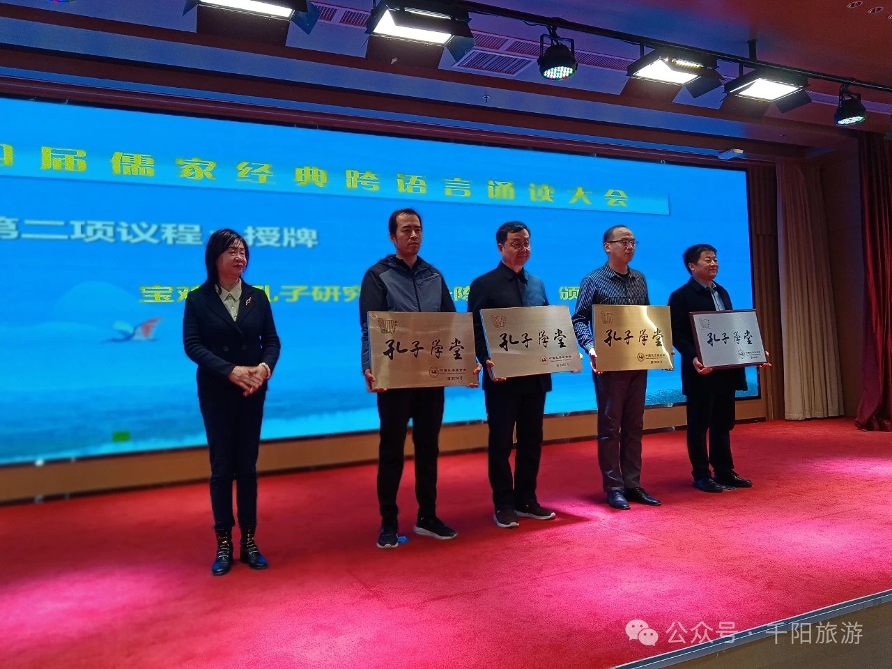启动仪式上,中国孔子基金会孔子学堂推进委员会委员陈宝霞为千阳燕伋小学、宝鸡文理学院外语学院、宝鸡市孔子研究会、宝鸡高新第三中学等四家孔子学堂授牌;为宝鸡市孔子研究会、千阳县文旅局颁发第四届儒家经典跨语言诵读大会公益支持单位证书。