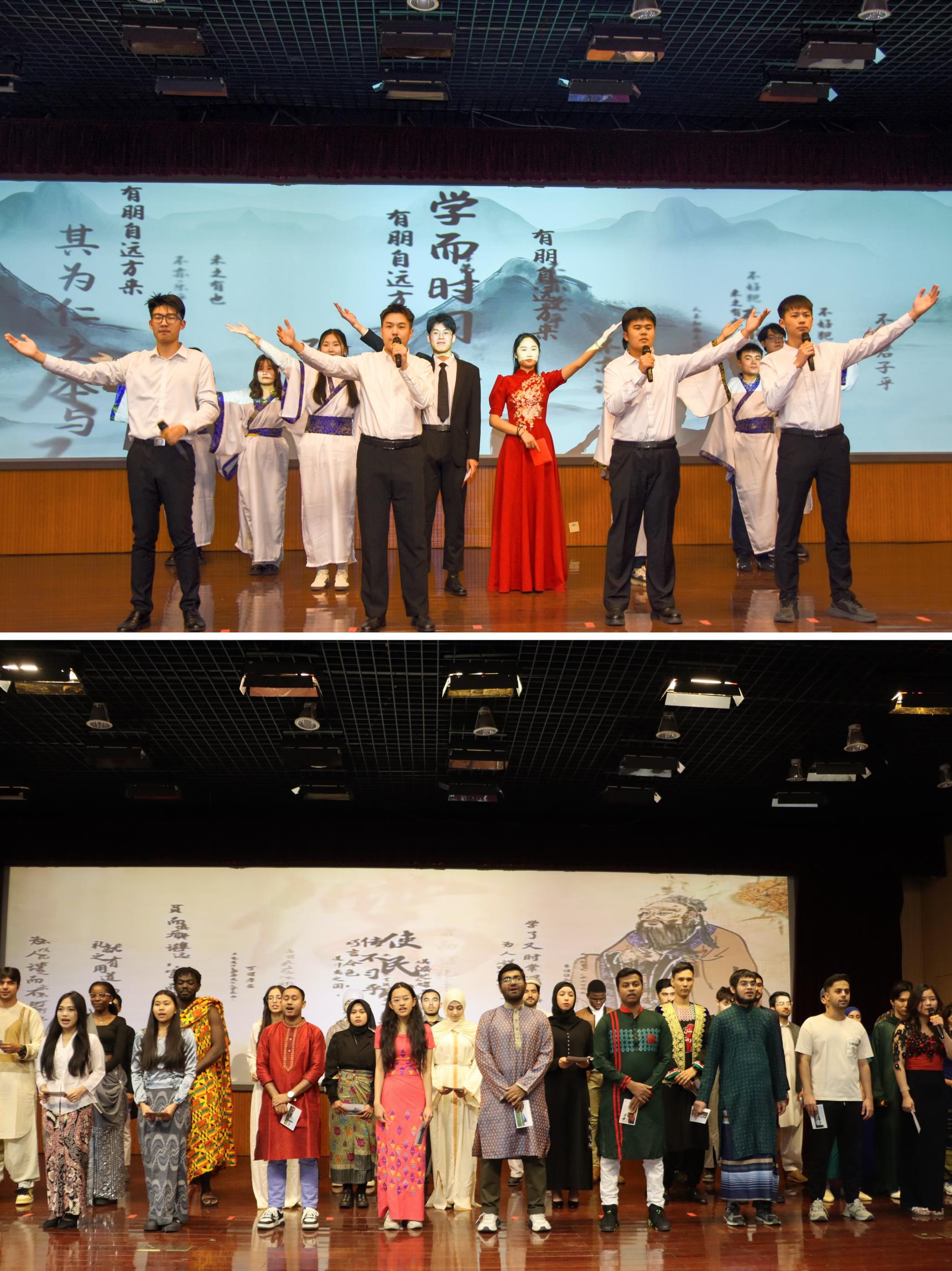 活动现场,中国石油大学(华东)文法学院、外国语学院的大学生们以及国际教育学院的留学生们用多语言诵读《论语》经典篇章,通过丰富多元的艺术表现形式,对经典进行了创新演绎,将儒家深厚的文化底蕴融入现代舞台表演。