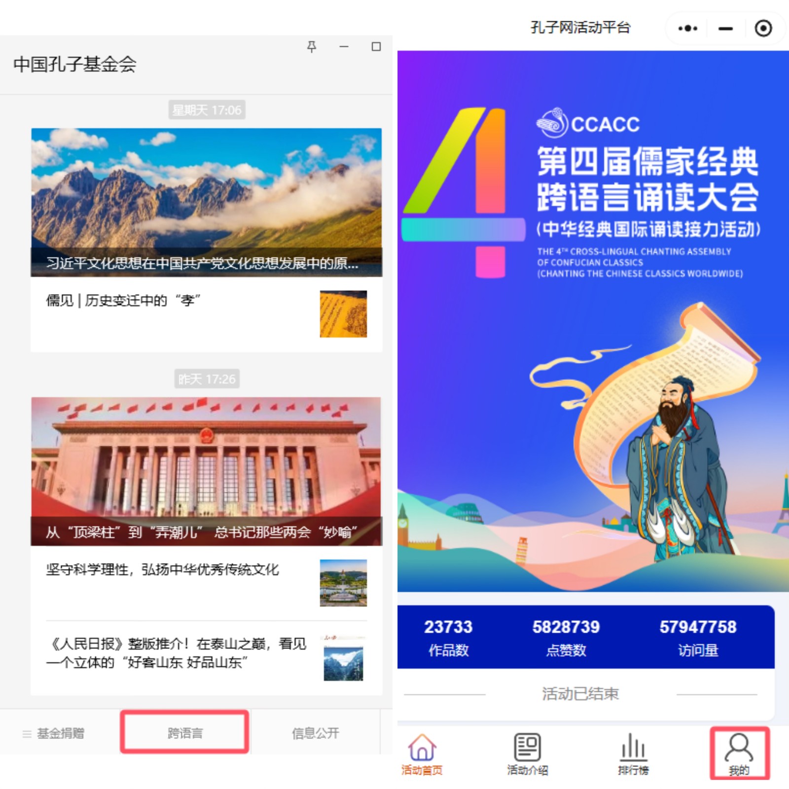 关注“中国孔子基金会”微信公众号,通过底部菜单“跨语言”进入活动小程序,点击“我的”进入个人中心页面,即可看到“证书下载”入口,点击相应证书进行下载。