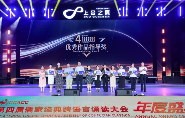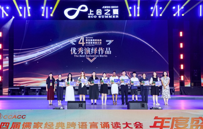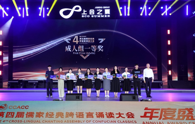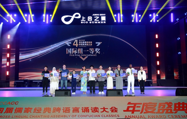 与会嘉宾为“第二届山东省儒家经典跨语言诵读大赛一等奖”获奖者代表颁奖