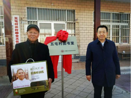 为丰富村民文化生活,在中国孔子基金会的资助下,五屯村新建起图书室,刘爱军同志与王志强同志共同为图书室揭牌,并向五屯村“孔子学堂”赠送了国学听读机。