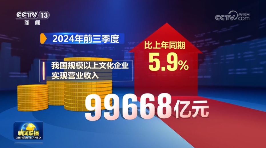 数据显示,今年前三季度,我国规模以上文化企业实现营业收入99668亿元,比上年同期增长5.9%。其中,文化新业态行业实现营业收入41616亿元,比上年同期增长10.0%。