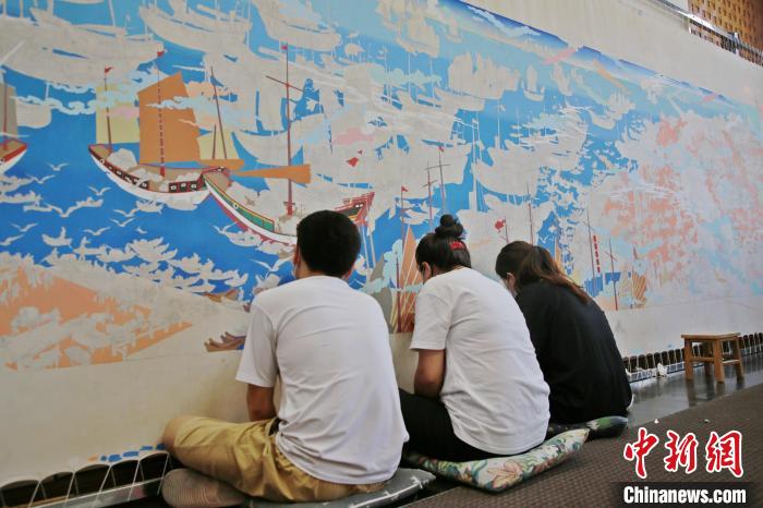 如今,扎西正在带领大家进行“东方大港”主题画卷的创作。画布上,蓝色的海洋占据了整幅画的一大部分,两百多艘来自世界各国的商船在海上停泊、远航。