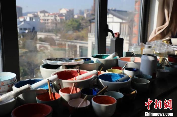 唐卡所用颜料由矿物石研磨成粉调和制成,色彩鲜艳。 李莹 摄
