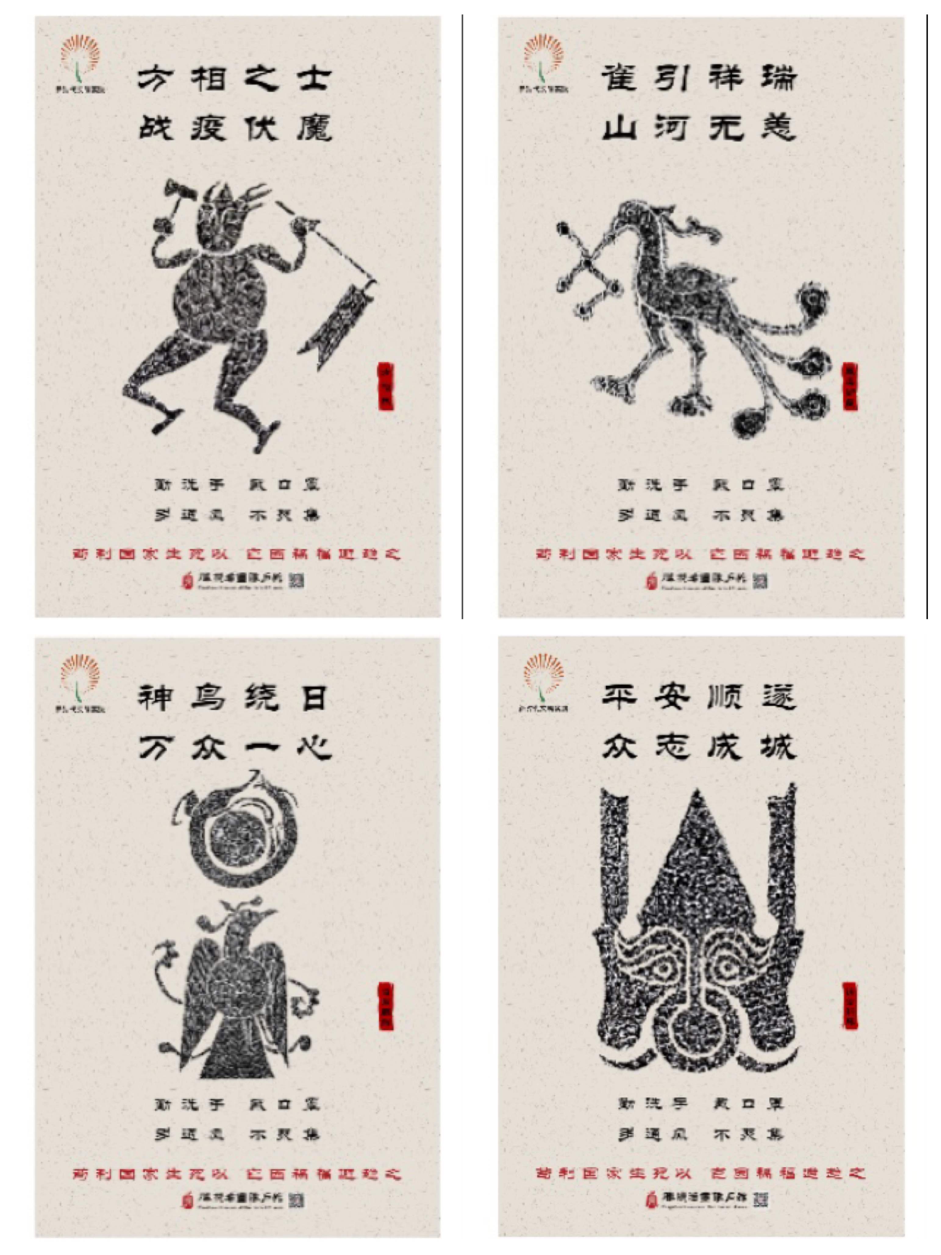 “神鸟绕日 万众一心”“平安顺遂 众志成城”“雀引祥瑞 山河无恙”“方相之士 战疫伏魔”,面对疫情,全国文博人众志成城,以不同形式祝愿祖国早日战胜疫情,滕州汉画像石馆也积极参与,设计发布了“文物有话说—汉‘话’战疫”海报,海报上部为八字两句的祝福文辞,中部以从汉画像石中提取的图像作为主打图,下部配以“勤洗手 戴口罩 多通风 不聚集”的防护小提示。生动的图像、典雅的措辞,辅以仿古感的底色,呈现出鲜明的滕州汉文化特色。