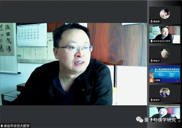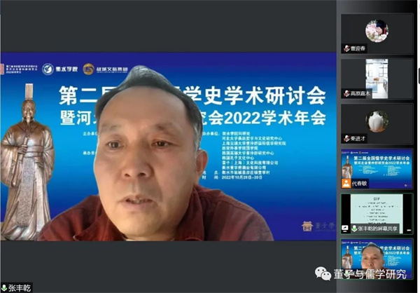29日下午,进行董仲舒思想分组学术研讨。本次大会共收到论文80篇。根据论文主题,讨论共分为6场,线上线下同时进行。与会学者陈述论文并就各自关注的研究进行深入的交流和讨论,既有对董学在儒学史上地位与价值的广泛思考,又有对董仲舒学说现代价值与现实意义的深切关注,在董学研究的诸多问题上都取得了新的突破,加深和拓展了董学研究的领域。