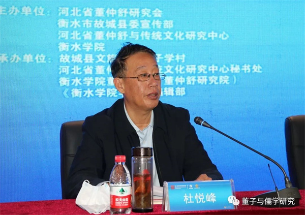 衡水市社科联主席杜悦峰致辞。他指出,董子文化是最具代表性的衡水历史文化资源。衡水市社科联和河北省董仲舒研究会应立足我市学术传统、学术资源,积极打造“大儒之乡”这一文化品牌,推进董子文化向省外、境外传播与交流,为衡水市哲学社会科学发展做出卓越贡献,努力推动衡水奋进新时代、引领新发展、开创新局面。