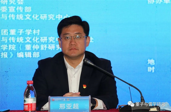 故城县政府县长邢亚超致欢迎辞。他指出,故城是董仲舒下帷讲诵之地,是儒学最重要的发源地之一。故城一直都注重中华优秀传统文化的传承和弘扬,今后将进一步推动董子文化的创造性转化、创新性发展,推动董子文化融入精神文明建设,走出一条具有故城特色的文化繁荣之路。