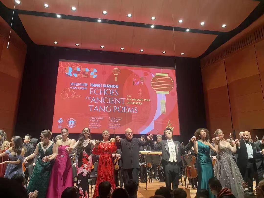 据中国对外文化交流协会消息,当地时间1月7日晚,由中国对外文化交流协会、中国驻纽约总领馆、中国常驻联合国代表团、中国银行、江苏省文化和旅游厅、苏州市人民政府共同支持的《唐诗的回响:iSING! Suzhou和费城交响乐团中国新年音乐会》完成费城首演后,在纽约林肯中心再次为观众奉献了一场“唐诗西韵”。