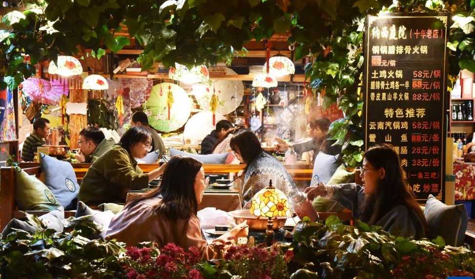 5月2日晚,游人在云南丽江古城享受美食。新华社发(赵庆祖 摄)