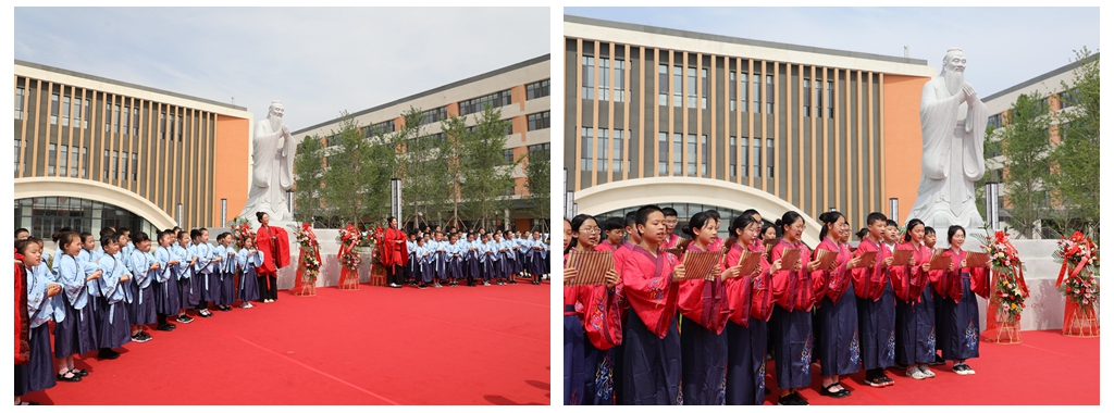 “不学礼,无以立”,礼是立身之本,是处事之要,学校师生怀揣对先师孔子的崇敬之情,进行礼乐表演。修身、齐家、治国、平天下,乐鼓响起,师生齐诵《礼记·大学》,从经典中寻找思想的真谛、智慧的源泉和文化的根脉。