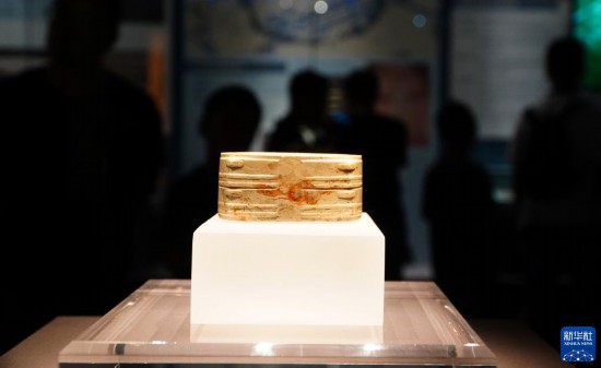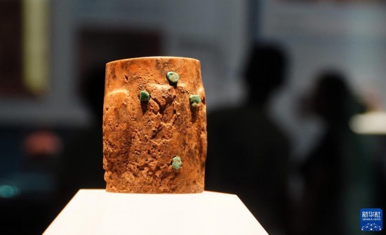 成果展上展出的山东省文物考古研究院藏大汶口文化嵌绿松石象牙雕筒(7月12日摄)。