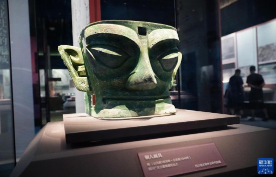 成果展上展出的四川省文物考古研究院藏四川广汉三星堆遗址出土铜人头像(7月12日摄)。