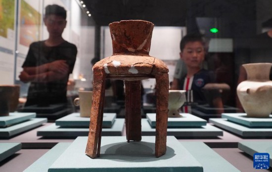 成果展上展出的山东省文物考古研究院藏龙山时代陶鼎(7月12日摄)。