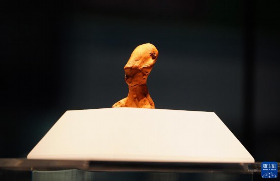 成果展上展出的湖北省文物考古研究院藏龙山时代陶塑人像(7月12日摄)。