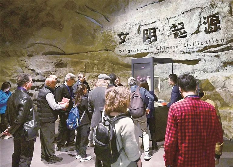 日前,首届世界古典学大会在京举行。图为中外嘉宾在中国考古博物馆参观“考古与中华文明溯源展”,该展是本届世界古典学大会推出的配套活动之一。新华社记者 张晨霖 摄