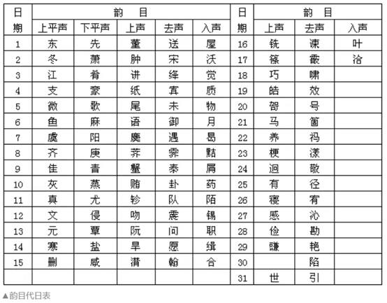 清末,我国采用农历历法,每个月最多30天。清末的洪钧就以金代编修的《平水韵》的韵目代替日期。前面15天用的是韵目表中上平声的全部,接着采用韵目表上声的10个,再是韵目表去声的5个。