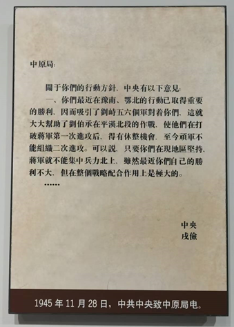 了解了这些,再在湖北宣化店中原突围纪念馆中看到“中央戌俭”就不会蒙圈了,原来这是中共中央11月28日发的电报。