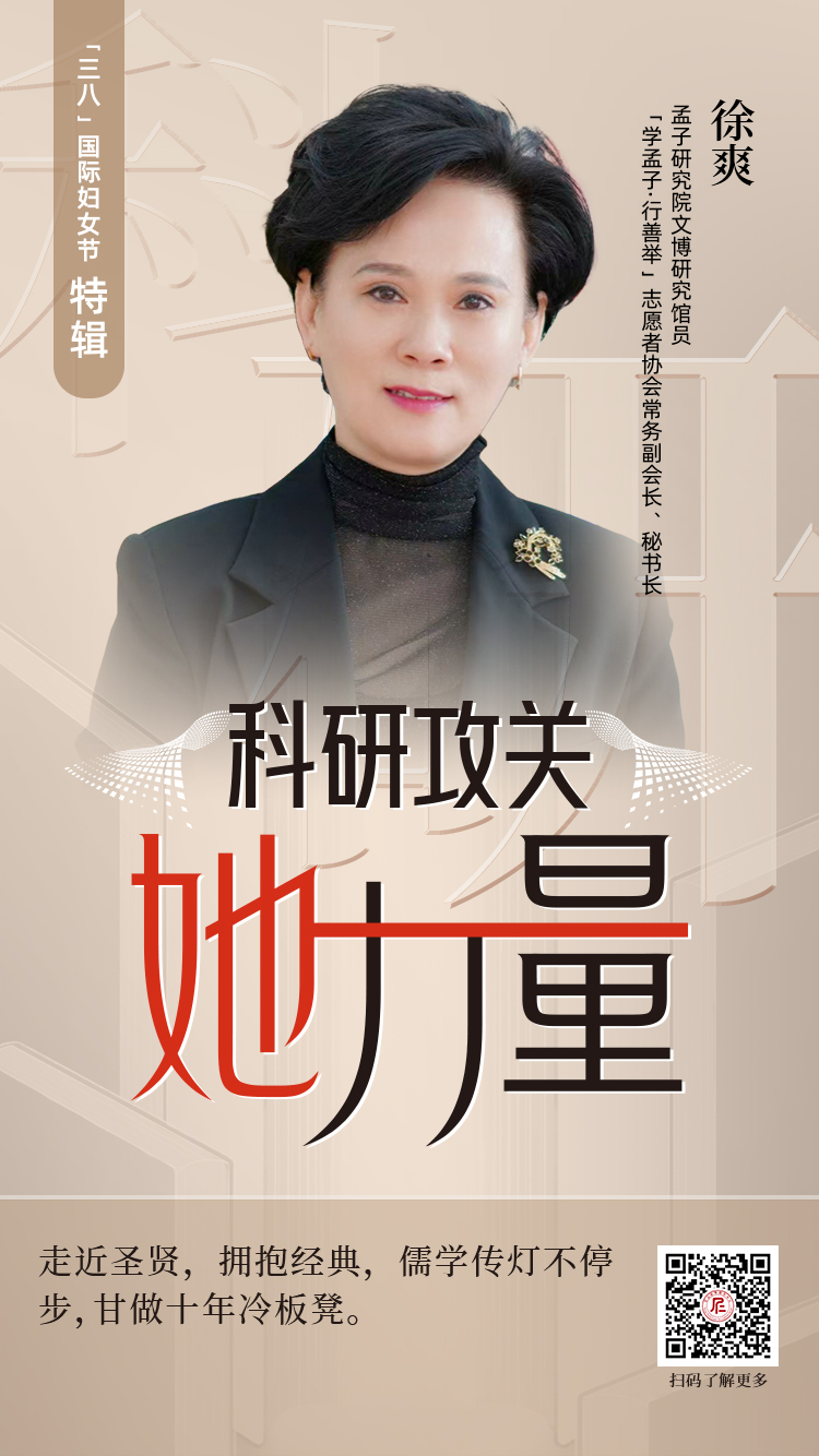 徐爽,孟子研究院文博研究馆员。“学孟子·行善举”志愿者协会常务副会长、秘书长。她立足孔孟之乡,坚持走近圣贤、拥抱经典,在儒家文化的传播、研究道路上几十年不辍。她的《圣者的叮咛》等专著和多项课题成果,展现了她在孟子文化和家风文化研究方面的深厚造诣。正如孟子所言:“穷则独善其身,达则兼善天下。”她将目光投向更广阔的社会,传播弘扬中华优秀传统文化,以实际行动为社会和谐发展贡献力量。