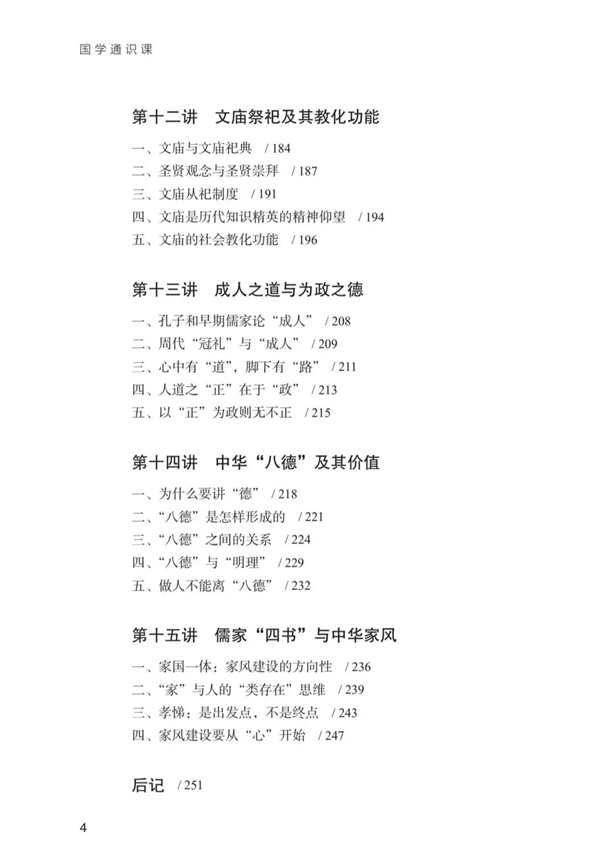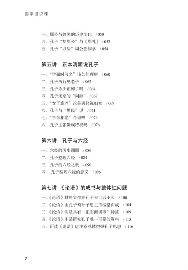 目录最初草成,我先征求意见,大家都觉得该书与人们通常理解的“国学”有一定距离。书稿交到出版社,我收到的初审意见也大致如此,略谓书稿内容主要是儒学,儒学虽是国学中非常重要的部分,但不能代表全部,不足以支撑“国学通识课”这一主题,建议增加除儒学以外的国学相关内容。本书主题有两个关键词,其一是“国学”,其二是“通识课”。所谓“通识”,指广博的知识,就是对各个方面的知识都有不同程度的了解。对于单一学科而言,通识课则偏重于该学科的基础性、一般性知识,既要有全面性,又要有概括性。所以建议在甄选内容及撰稿时把握这一原则。