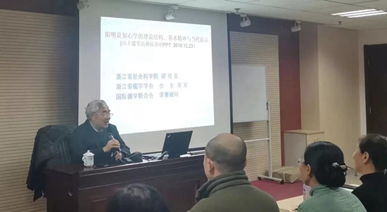 随后,吴光教授向听众讲解了自己对阳明“良知心学”理论结构的认识。他认为,以往的阳明学研究重哲学而轻政治,重“内圣”而轻“外王”,重形而上而轻形而下。比如阳明学“三大论”——“心即理”“致良知”“知行合一”都是讲形而上的“内圣”之学。阳明“良知心学”的理论结构应该由如下四个部分组成:一是“良知”本体论,即从“心”本体论到“良知”本体论。“心即理”命题是继承自陆象山的,并非王阳明首创,而经历“百死千难”得来的“良知”二字才是王阳明心学体系中确立道德理性的核心价值。二是“致良知”的方法论,也就是以良知为标准去衡量一切事物。这也是他认识事物之理和整个世界的根本方法。三是“知行合一”的实践论,而“知”和“行”是不能割裂的、辩证的,“行”的根本目的是达于至善。这也就是说,“知行合一”实际上在本质上是一种道德实践论。四是“明德亲民”的“民本”论,即一直被忽略的“外王”之学,三层要点分别是“爱民保民”“顺应民心”“安民富民”。