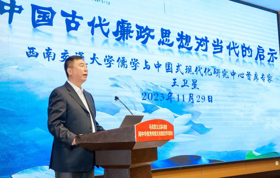 王卫星作了题为《中国古代廉政思想对当代的启示》的主题报告。他认为中国历代清官廉吏无不将清廉视为从政最宝贵的品质和最基本的要求。新时代廉洁文化建设是深入推进全面从严治党向纵深发展的重要保障;是培育风清气正良好政治生态的重要举措;是推进文化自信自强的坚实支撑。