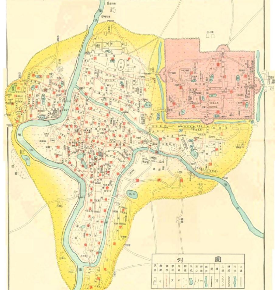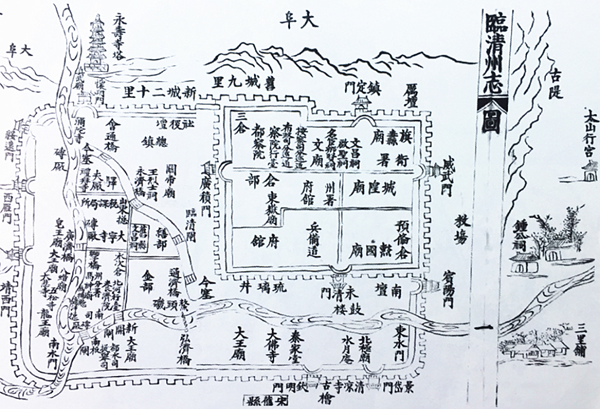 (三)临清城市的造型。在中国古代城市发展史中,县城、州城的营造均有一定的体制,大略为四方形,这是政治城市的特色。临清自明代以来,转变为全国性商业都市,其城池因地制宜,顺应河势,不拘一格,形制为二城一池,防御体系日臻完善。砖城以广积仓为基础,“故其西北凸出,俗谓之幞头城” ,当地百姓又称之为“纱帽城”。砖城四座城门均不相对,四条大街皆不直通,因而形成一个卍字形。砖城四周掘以又宽又深的护城河,并建筑四座桥对应于城门,桥名以城门名命之。护城河里的水主要来自运河,护城河通过月河与运河相连。月河即小型水柜,当运河水涨之时,河水流入月河,枯水之际月河里的水再补给运河。土城横跨运河两岸,按照卫河以及会通河两条支流不规则的弯曲形状,在河外加阔开深堆筑而成。二城相连形似“葫芦含丹系玉带”,因而临清城市造型是一个宝瓶城。