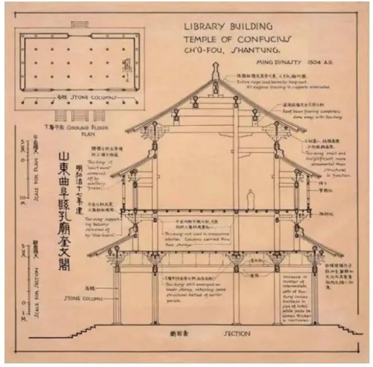 奎文阁最初名为“藏书楼”,如今悬挂着的“奎文阁”匾额是乾隆皇帝来孔庙时所题写的。藏书楼建成之后庋藏了宋太宗御书的157幅卷轴及儒家九经等书籍,是至道三年(997)宋真宗赏赐给孔子四十五代孙孔延世的。由此看来,在当时佛、道冲击的背景下,宋代人用精湛的工艺在儒家文化发源地曲阜孔庙建造了藏书楼,并将儒家经典珍藏在内,其用意就是要将儒家思想提升至主流思想的高度,让更多的人崇信儒学,“崇儒重道,可谓至矣”(《奎文阁重置书籍记》)。而取名“藏书楼”也就更加体现了“书”的重要性,它向世人展示这些儒家经典就是与佛、道的“经”相抗衡的有力范本,藏书楼也为中华文化的存续发展保存了珍贵火种。
