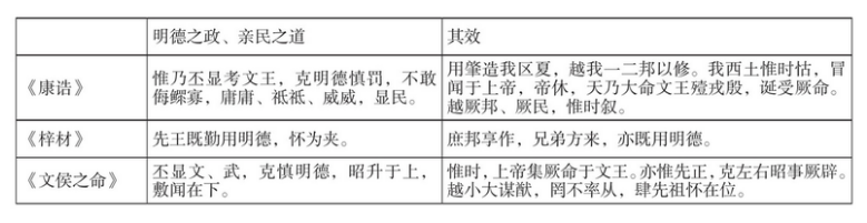 类似的,如《梓材》云:“先王既勤用明德,怀为夹。庶邦享作,兄弟方来,亦既用明德。”意思是说,文王、武王勤用明德,怀远为近,以至于众多小国皆来朝享,兄弟之邦亦来宾服。又《文侯之命》云:“丕显文、武,克慎明德,昭升于上,敷闻在下。惟时,上帝集厥命于文王。亦惟先正,克左右昭事厥辟。越小大谋猷,罔不率从,肆先祖怀在位。”意思是说,文王、武王能戒慎明德,故受命于天;能任用左右贤良之臣,故天下无不顺从。以上说法,我们可以列一个表格。