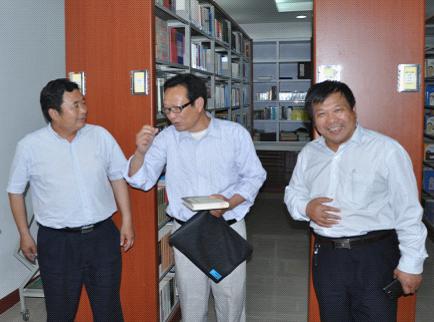 中国孔子基金会传统文化巡讲团王洪铁教授在国学流动图书馆内与山东神学院负责人亲切交谈。