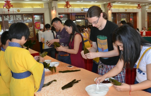 随后,中外学生一起开始了包粽子比赛。经过齐鲁膳艺餐饮研究院膳艺师的示范指导,大家迅速掌握了包粽子的诀窍,踊跃参加包粽比赛。看着手中像模像样的粽子,大家兴奋不已,并从中体会到了端午传统文化在日常生活中的渗透。