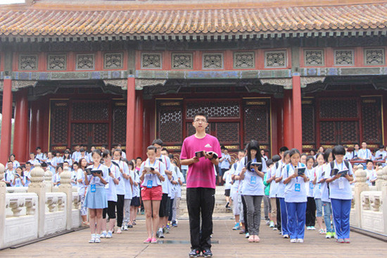 7月20日,中学生中华传统文化传承高端论坛在孔庙和国子监博物馆隆重举行开营仪式。在仪式前的晨起诵读中,中央电视台新闻主播郎永淳与二附中2015届毕业生王威、贾晓文、蒋青原、何天宇四位同学领诵,150名青年学生共同诵读《论语》、《大学》、《老子》、《诗经》、《离骚》等选段。