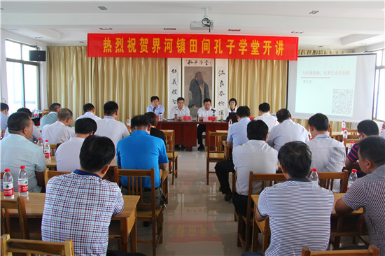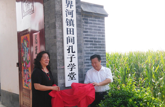 2015年8月26日上午,滕州市界河镇田间孔子学堂举行了隆重的揭牌仪式,中国孔子基金会普及传播部主任邹丽妍和界河镇党委书记宗兆波为田间孔子学堂揭牌,这也是中国孔子基金会在田间开设的第一个孔子学堂。田间孔子学堂从课堂走到了田间地头,深入到群众中间,真正做到了“接地气”。