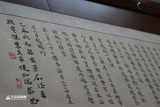 青岛新闻网12月3日讯 今年12月2日是国务院批准设立的第四个“全国交通安全日”,主题为“拒绝危险驾驶、安全文明出行”。昨日,青岛市“全国交通安全日”集中宣传周启动仪式在蓝树谷平度市交通安全体验馆举行,也标志着青岛市第一家交通安全体验馆正式启用。馆内书法长廊中,由六位书法家联合创作的60米《中华人民共和国道路交通安全法》书法长卷,吸引了大批参观者的目光。
