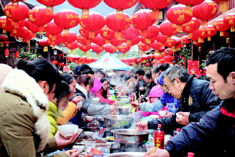 1月24日,游客在“黔北记忆”旅游文化产业园品尝地方特色小吃。在为期一个月的遵义首届传统文化节中,游客从吃、喝、玩、乐、游、购等方面感受浓浓年味。本报记者 邓刚 摄