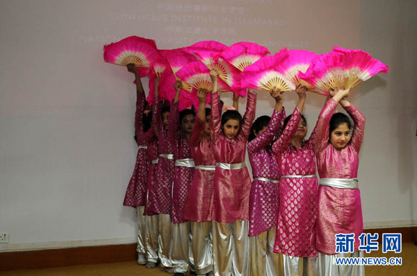 2月19日,在巴基斯坦首都伊斯兰堡,伊斯兰堡孔子学院及其合作学院的学生正在表演欢庆中国元宵节文艺节目。新华网记者季伟摄