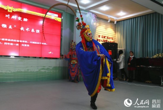 川剧变脸与“美猴王”武术表演结合,赢得师生们掌声一片。(王军 摄)