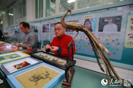 艺术家展示的棕编孔雀作品。(王军 摄)