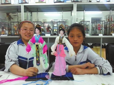 十二中洋桥学校艺术专项组组长李玲玲介绍,多年前北京绢人厂在学校建厂,依靠这个得天独厚的机会,学校开办了绢塑工艺实践小组。为了弘扬绢塑这种传统艺术和非物质文化遗产,2010年9月学校特开设了此门课程,成为非物质文化遗产培训基地。